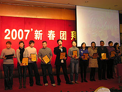 華夏歡唱四海正逢盛世春,瑞雪紛飛九州已兆豐收景”,在“金豬送福”的祝福聲中集團(tuán)各單位員工歡聚一堂,共同回顧2006暢想2007。會(huì)場(chǎng)上歡聲笑語(yǔ),文藝節(jié)目精彩紛呈,抽獎(jiǎng)環(huán)節(jié)激動(dòng)人心。董事長(zhǎng)為在集團(tuán)工作十年以上的老員工頒發(fā)“十年特殊貢獻(xiàn)獎(jiǎng)”,更讓大家體會(huì)到華瑞以人為本的文化特色,體會(huì)到集團(tuán)董事會(huì)對(duì)員工無(wú)微不致地關(guān)懷。