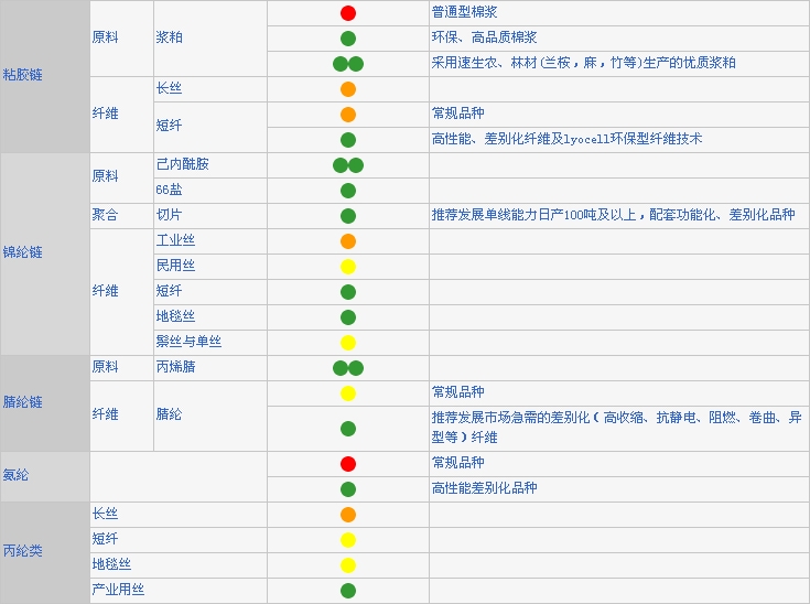 本預警系統監測的品種涵蓋化纖行業主要產品,分為紅、橙、黃、綠、雙綠五種類別,分別代表風險極大,風險較大、有一定風險、鼓勵發展、重點扶持。可以結合預警類別及內容,根據企業生產經營實際情況進行判斷。